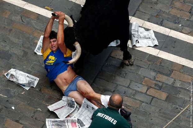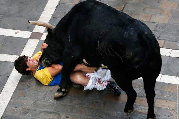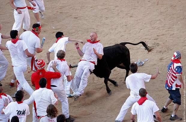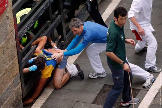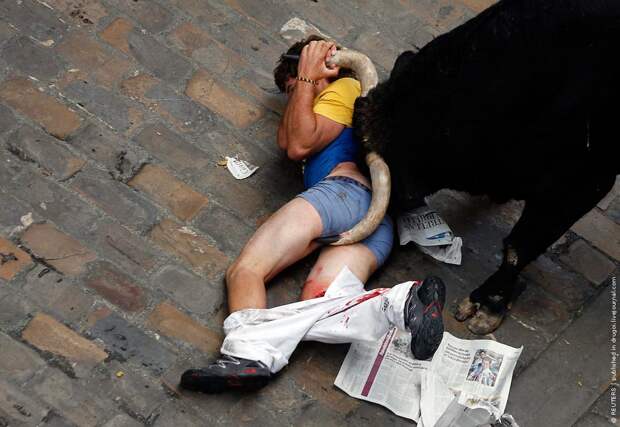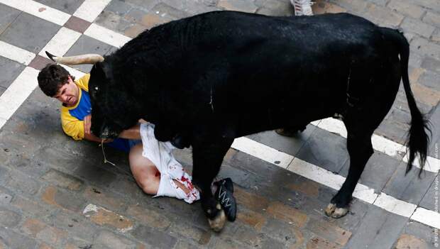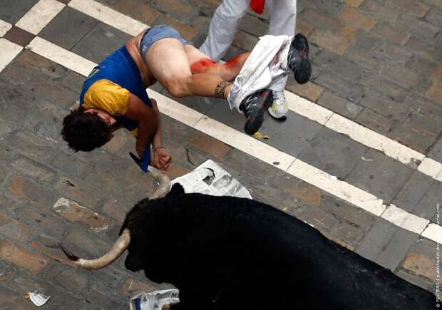 Быки ранили троих, и довольно серьезно - 20-летнему американцу, которому бык заехал рогом в живот, пришлось удалить селезенку.Необъяснимое самопожертвование! Киты выбрасываются на песок, здоровые мужики на рога безмозглой скотины....