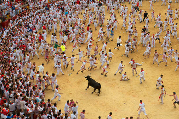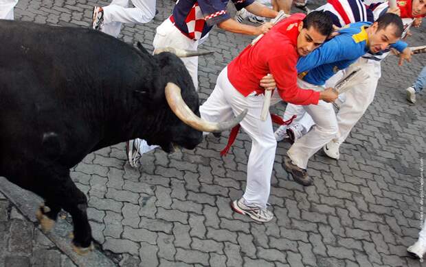 Фестиваль Сан-Фермин - это не только гулянки, пьянки и погуголые испанки, это то еще и безумный забег с быками... Но народу явно нравится, а быкам???